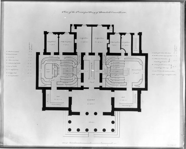Dundalk - Palazzo di giustizia - pianta, Ripresa di due progetti di Owen Fahy: si tratta delle piante del primo e secondo piano del Palazzo di giustizia di Dundalk, 1840 ca.; l'opera è conservata a Dublino, The Irish Architectural Archive