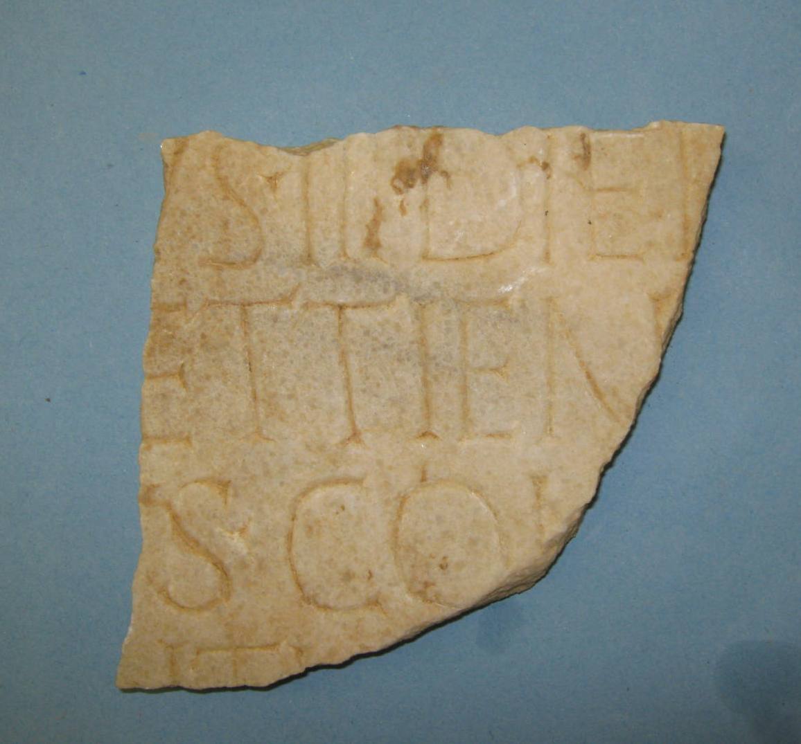 Frammento di iscrizione in lingua latina su lastra mutila in marmo, n. 4 linee. Ductus alquanto regolare. segni di punteggiatura; due triangoli nella prima e nella terza linea.. Rinvenuta in uno scavo effettuato per trincee, trincea n. 2, tomba F. Dalle poche notizie pervenute: reperto epigrafico rinvenuto nella trincea n. 2, a destra dell'anfiteatro, sulla parete rimossa dall'aratura del trattore, a ca. 50 cm. dalla superficie del terreno, insieme a tegole e alle ossa di un defunto. Tomba F