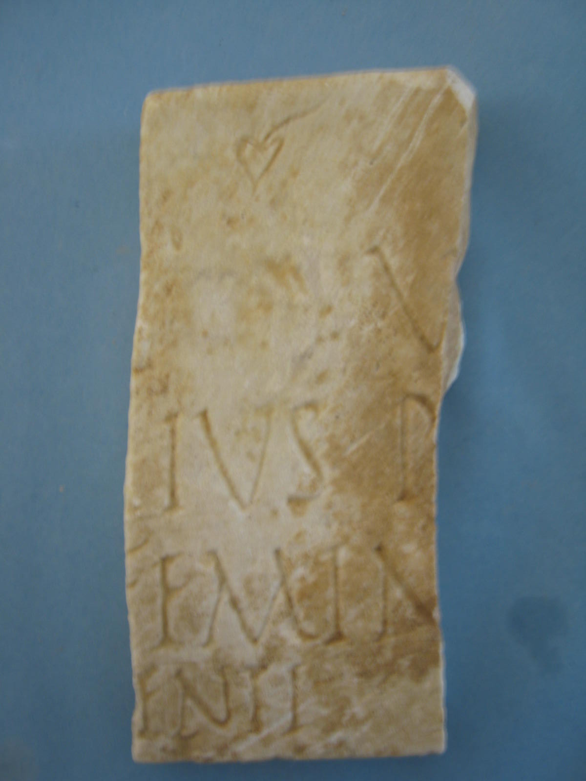 Frammento di lastra in marmo con iscrizione latina funeraria, su quattro linee, hedera distinguens sopra la prima, forse un altro segno di interpunzione nella terza linea, ductus irregolare. Lettere incise in modo non troppo accurato.. Iscrizione funeraria portata alla luce durante lo scavo effettuato il giorno 17/10/1980, nella trincea n. 5, a destra dell'anfiteatro, tomba E, a ca. 80 cm. di profondità