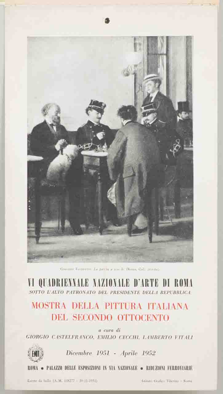Lettura iconografica: riproduzione fotografica di dipinto; La partita a scacchi. Categoria merceologica/ tipo evento: manifestazioni culturali; mostre; mostra d'arte; pittura; istituzioni culturali; gallerie; galleria d’arte; istituzioni; Presidente della Repubblica; patrocinio; turismo; enti di promozione turistica; trasporti; riduzioni ferroviarie. Nomi: Sesta Quadriennale Nazionale d'Arte di Roma; Mostra della Pittura Italiana del Secondo Ottocento; Favretto Giacomo; Castelfranco Giorgio; Cecchi Emilio; Vitali Lamberto; Palazzo delle Esposizioni; ENIT; Ente Nazionale per l’incremento delle Industrie Turistiche. Luoghi: Roma