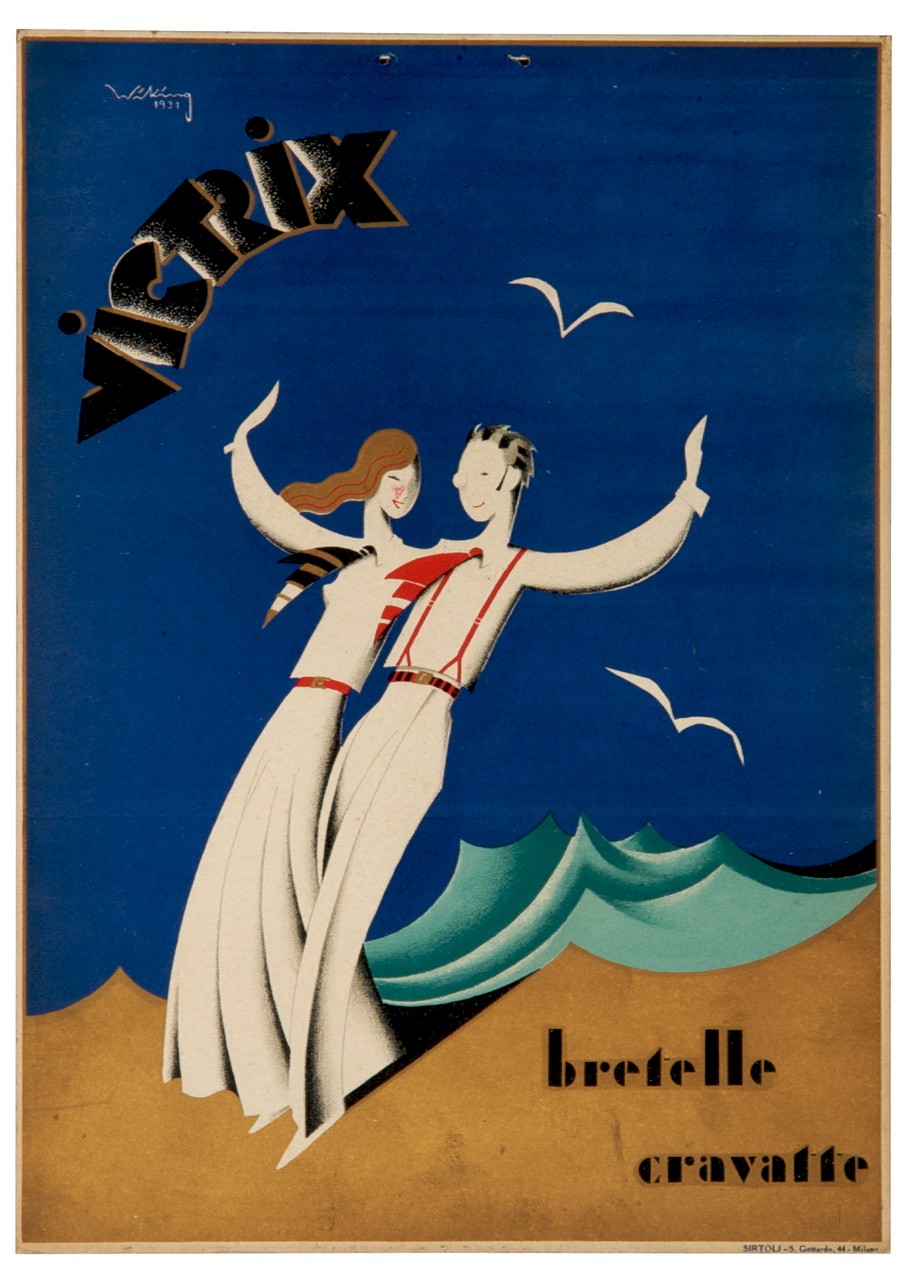 Lettura iconografica: figura maschile; figura femminile; coppia; cravatte; bretelle; mare. Categoria merceologica/ tipo evento: industria tessile; accessori per abbigliamento; cravatta; bretelle. Nomi: Victrix