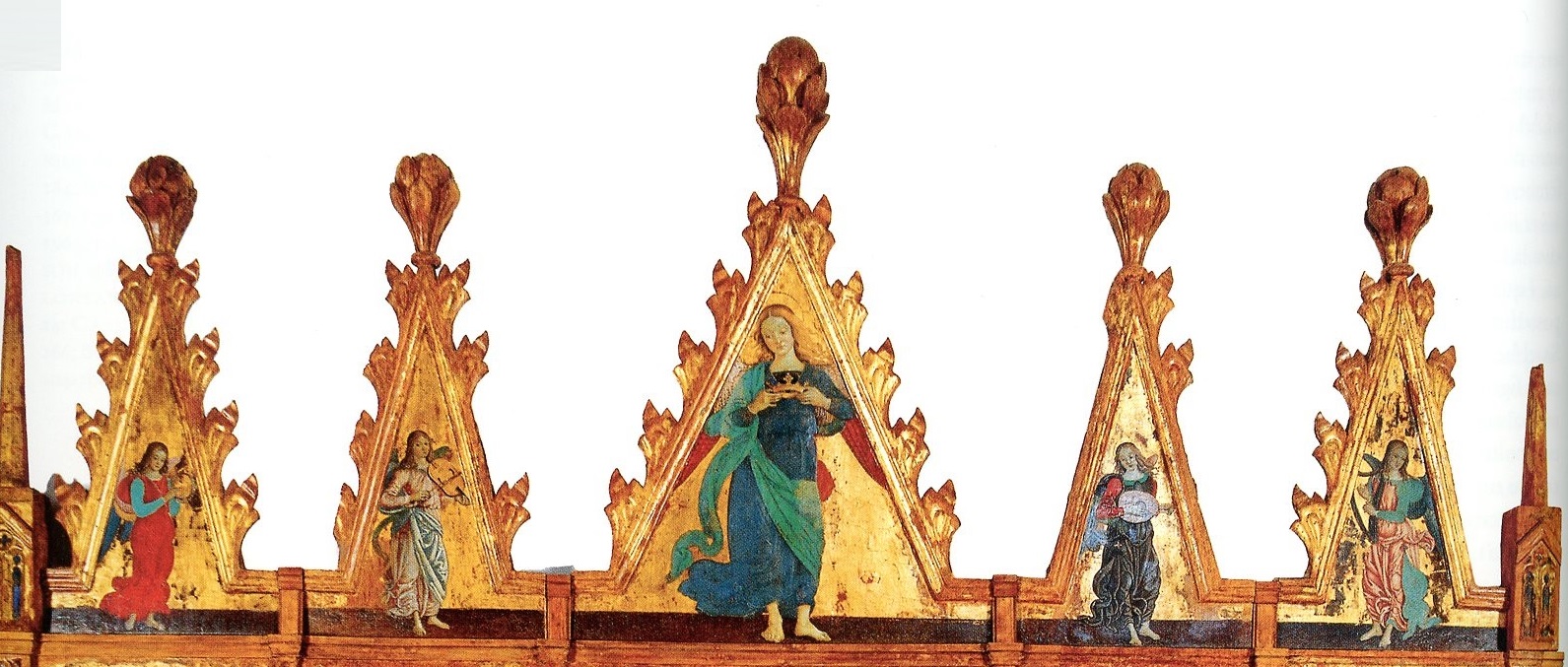 Quattro meravigliosi angioletti, di dimensioni ridotte, accompagnano la scena del polittico con strumenti musicali: un tamburello, una viella, un liuto e un'arpa. Li ritroveremo negli angeli musicanti dipinti da Saturnino Gatti nella chiesa di San Panfilo a Tornimparte. Hanno vesti ricche dai colori vivaci e dagli ampi panneggi gonfiati dal vento.. Angeli Musicanti