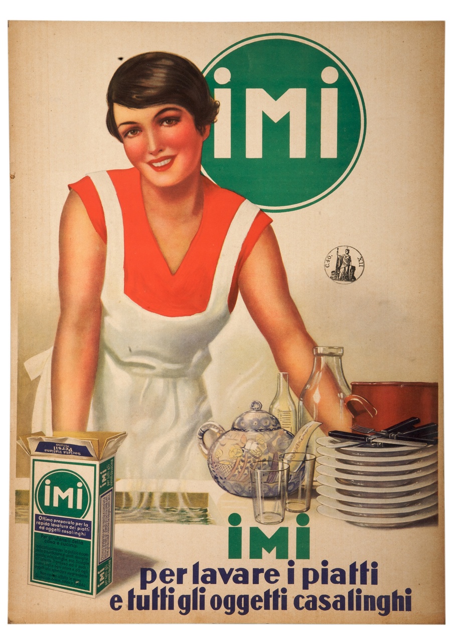Lettura iconografica: figura femminile; stoviglie; piatti; bicchieri; posate; bottiglie; teiera; pentola. Categoria merceologica/ tipo evento: industria chimica; saponi e detergenti; detersivo per stoviglie. Nomi: IMI; Società Italiana Persil. Luoghi: Milano