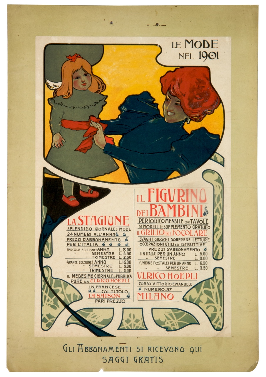 Lettura iconografica: figure femminili; donna; bambina; nastro; fiocco. Categoria merceologica/ tipo evento: informazione e comunicazione; editoria; periodico mensile; periodico bisettimanale; moda; tempo libero. Nomi: La Stagione; La Saison; Il Figurino dei Bambini; Il Grillo del Focolare; Ulrico Hoepli. Luoghi: Milano