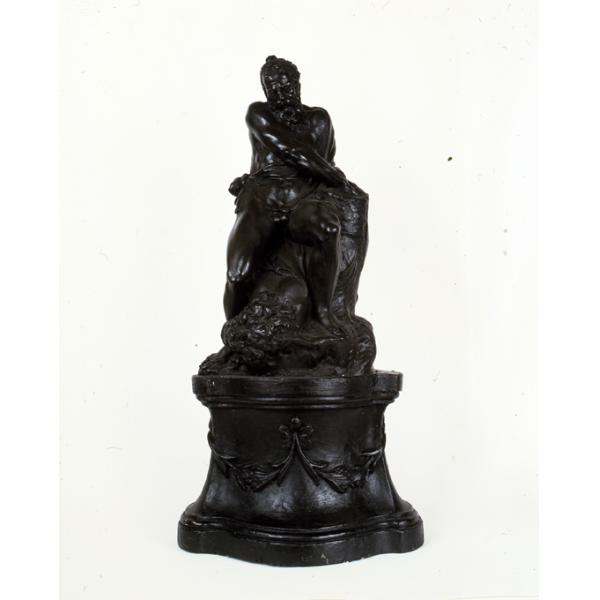 Figura maschile barbata e ignuda, con entrambe le mani bloccate nella fenditura del ceppo di un albero, attaccata da un leone. Patina bruna; fusione cava.. Personaggi: Milone da Crotone. Animali: leone