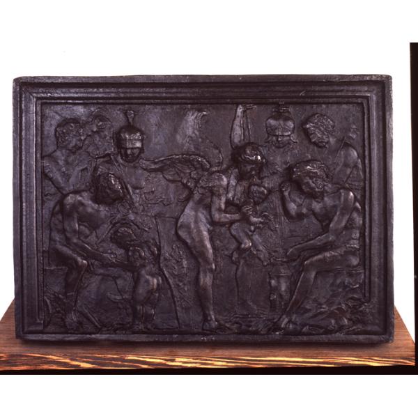 Bassorilievo raffigurante sulla destra Vulcano che forgia le ali di Amore, mentre sulla sinistra Mercurio lo educa insegnandogli a leggere e a scrivere. Al centro Venere, alata, sostiene Amore sulle ginocchia; in secondo piano altre quattro divinità, tra le quali Marte e Minerva. Patina bruna.. Divinità: Venere, Cupido, Vulcano, Mercurio, Marte, Minerva. Oggetti: ali, frecce