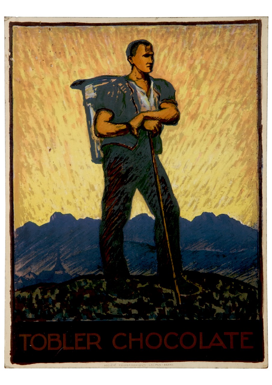 Lettura iconografica: figura maschile; gerla; bastone; monti. Categoria merceologica/ tipo evento: industria alimentare; cioccolato; dolciumi al cioccolato. Nomi: Tobler. Luoghi: Svizzera; Berna