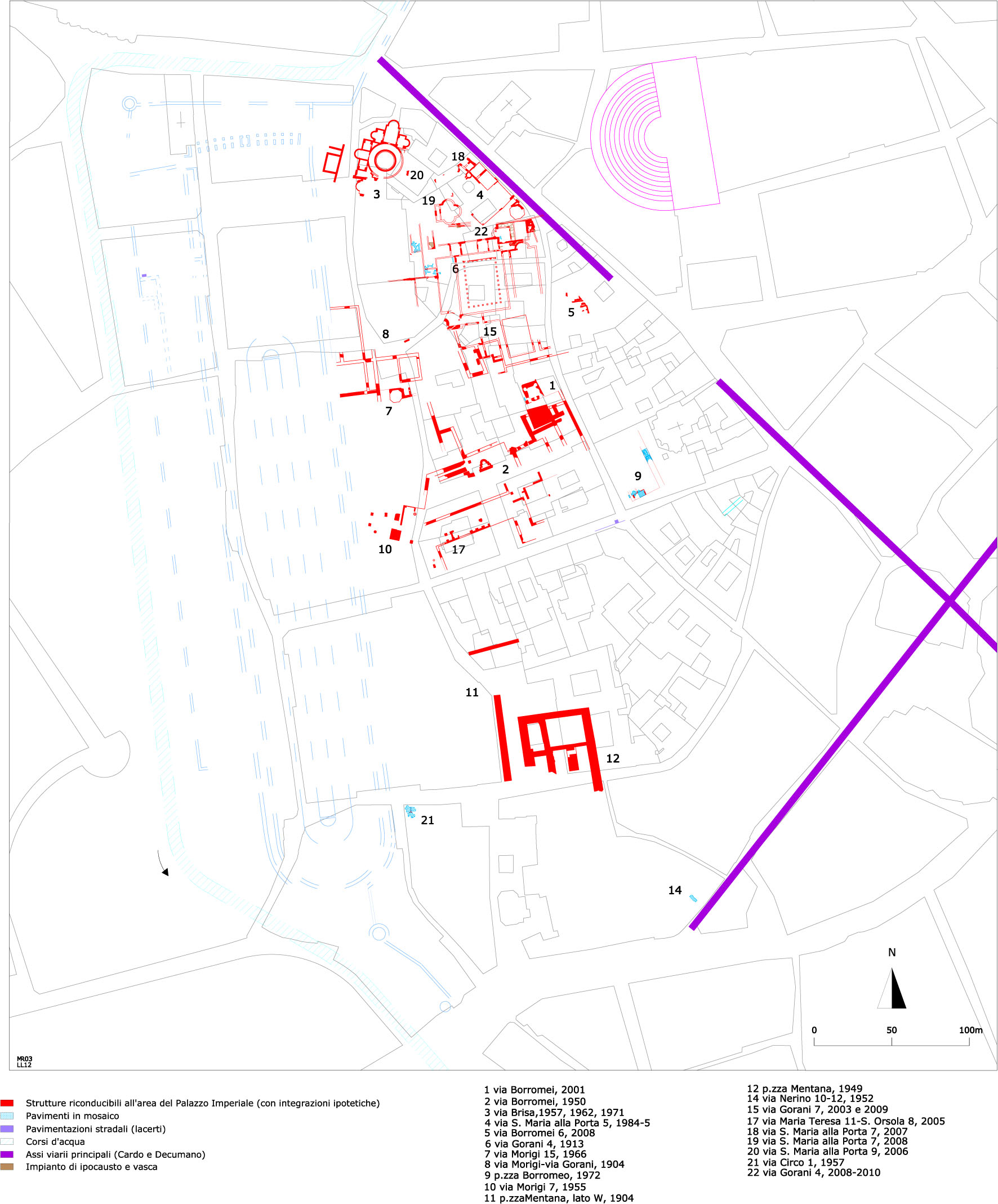 I resti fanno parte delle strutture del palazzo imperiale. E' stato messo in luce un grande complesso, di cui rimangono fondazioni in conglomerato di ciottoli e qualche tratto di alzato in laterizi. Vi sono anche tracce di pavimenti in laterizi a diversi livelli e suspensurae. Le pareti sono intonacate con cocciopesto e a sud vi sono tracce di una vasca. Si tratta di un gruppo di vani absidati disposti in modo simmetrico intorno ad un ambiente centrale del diametro di 20,70 m, sul cui muro ad anello doveva poggiare un colonnato interno, preceduto da un atrio anch’esso absidato. L'edificio, che aveva un impianto di riscaldamento, al momento della scoperta era stato ritenuto termale e solo successivamente è stato riferito al settore di rappresentanza del palazzo imperiale. Dall’atrio a forcipe, il corridoio con le estremità absidate, si accede al peristilio circolare su cui si affacciano tre gruppi di ambienti. Al centro la grande sala absidata in asse con l’ingresso è un probabile triclinio. Gli ambienti laterali simmetrici, absidati e con nicchie, possono essere interpretati come cubicoli con le alcove per i letti. I gruppi di vani sui due lati sembrano svolgere la stessa funzione di quello centrale, con triclini e cubicola con le alcove di dimensioni minori. Il complesso presenta confronto con analoghe strutture della villa di Piazza Armerina, interpretate come appartamenti del “dominus”, e suggerisce di riconoscervi un settore di rappresentanza del palazzo imperiale, articolato in tre appartamenti distinti. I resti sono stati conservati in situ