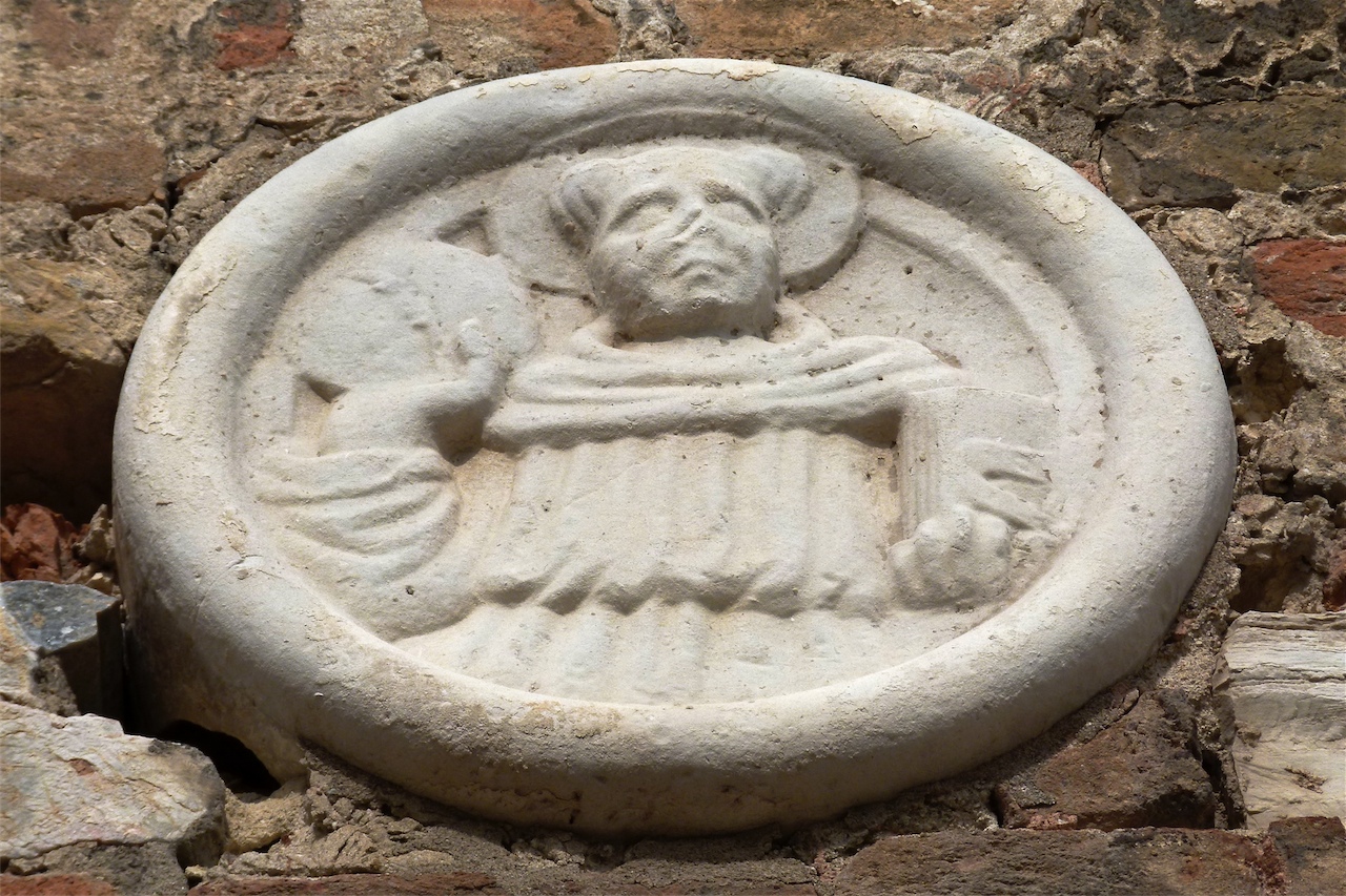 entro cornice agettante raffigurazione di mezzo busto di Santo frate con libro (nella mano destra) e globo (nella mano sinistra). personaggi sacri