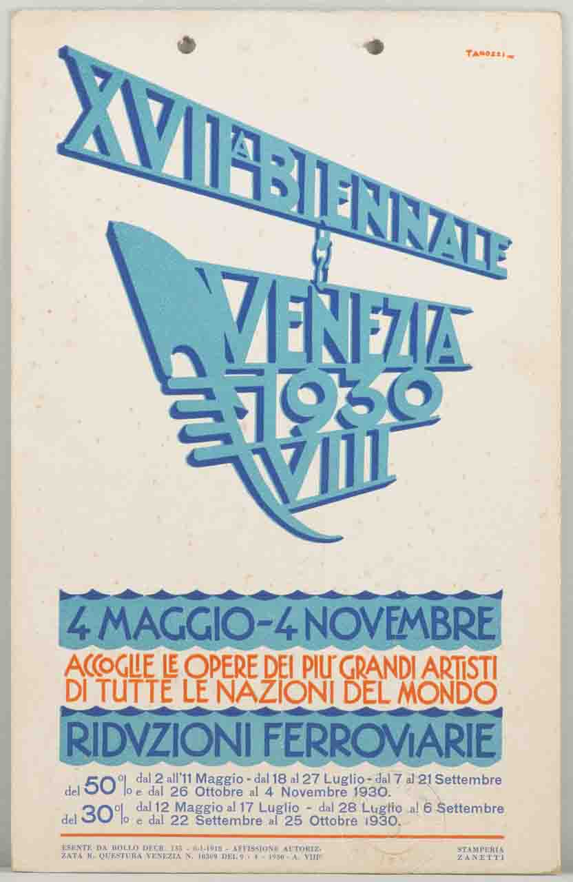 Lettura iconografica: insegna; ferro di prua di gondola. Categoria merceologica/ tipo evento: manifestazioni culturali; esposizioni; esposizione d'arte; trasporti; compagnia ferroviaria; riduzioni ferroviarie. Nomi: Diciasettesima Biennale di Venezia. Luoghi: Venezia