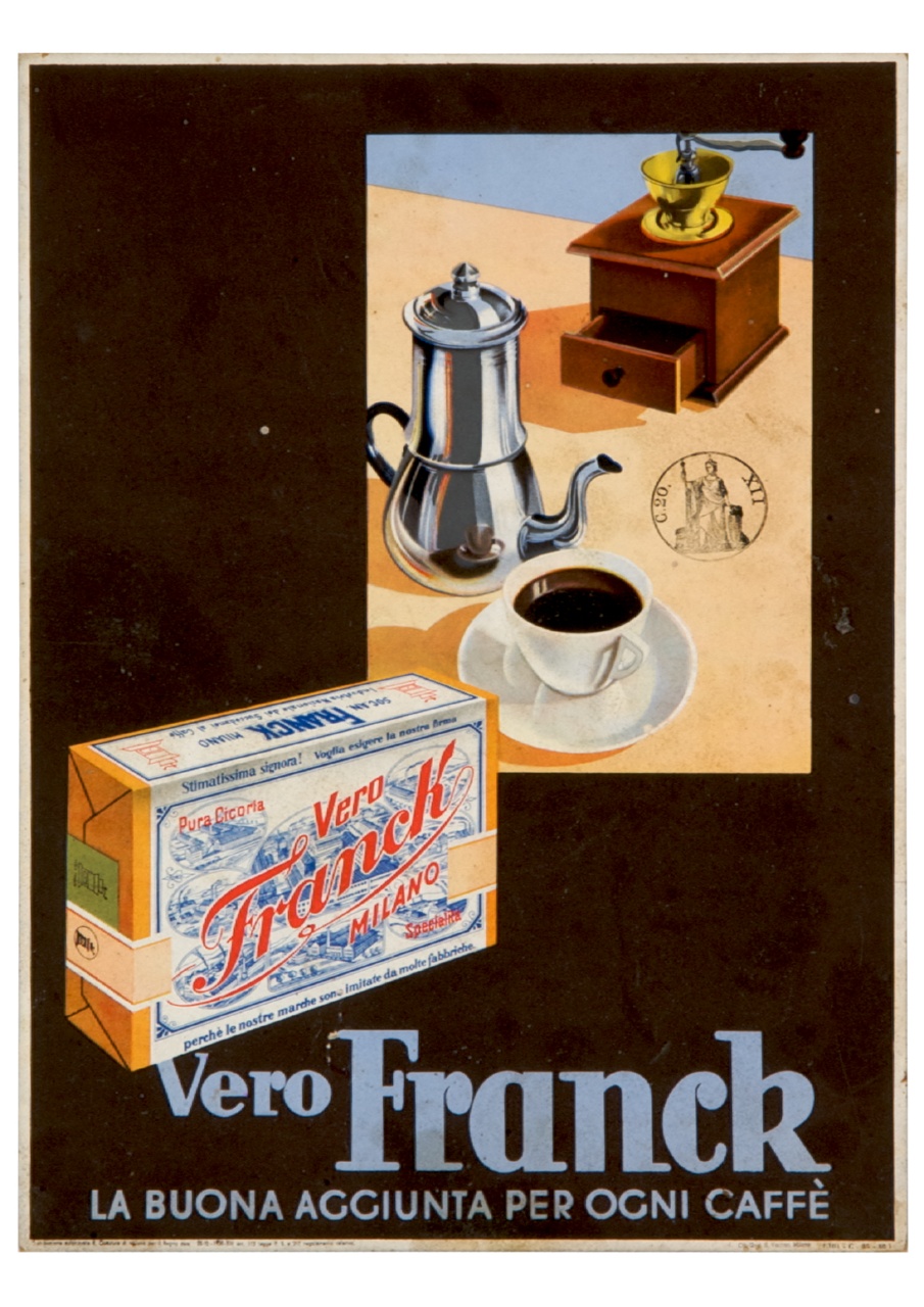 Lettura iconografica: confezione di succedaneo del caffè; tazzina; macinacaffè; caffettiera. Categoria merceologica/ tipo evento: industria alimentare; succedanei del caffè; cicoria. Nomi: Vero Franck; Franck; Industria Nazionale dei Succedanei al Caffè. Luoghi: Milano