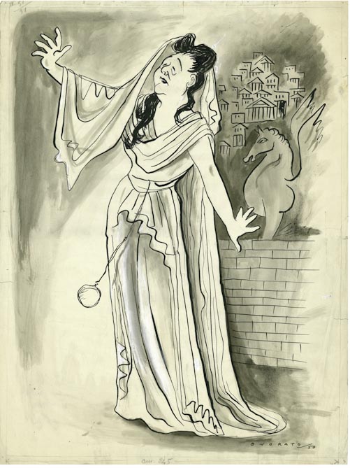 Disegno a matita, inchiostro, biacca e china acquerellata su carta avorio.. Caricatura dell'attrice Tatiana Pavlova in "La lunga notte di Medea" di Alvaro Corrado