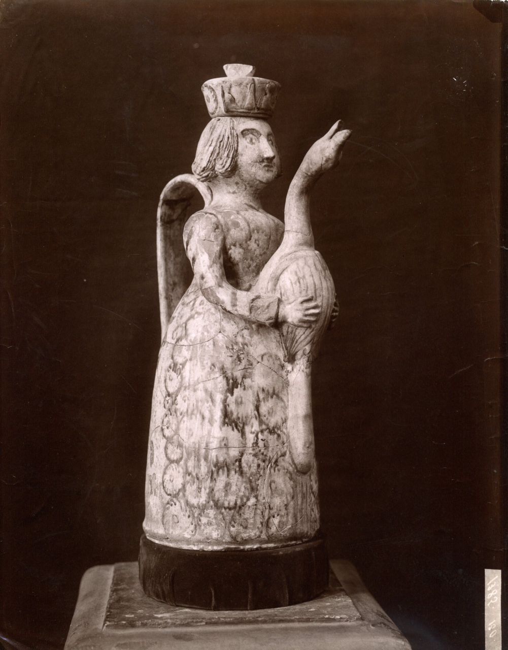 arti applicate-maioliche-bottiglie-aste; commercio antiquario-Volpi, Elia-Morgan, John Pierpont; Stati Uniti-Hartford-Wadsworth Atheneum Museum of Art, Bottiglia a foggia di figura femminile che sorregge un'oca, XV secolo, oggi ad Hartford, Wordsworth Atheneum of Arts