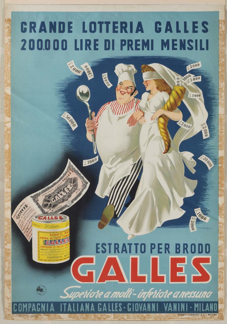 Lettura iconografica: figura maschile; figura femminile; cuoco; dea Fortuna; denaro; soldi; cartamoneta; confezione di estratto per brodo; biglietto della lotteria. Categoria merceologica/ tipo evento: industria alimentare; preparati per brodi; estratto di carne; tempo libero; lotteria. Nomi: estratto per brodo Galles; Grande Lotteria Galles; Compagnia Italiana Galles; Giovanni Vanini. Luoghi: Milano