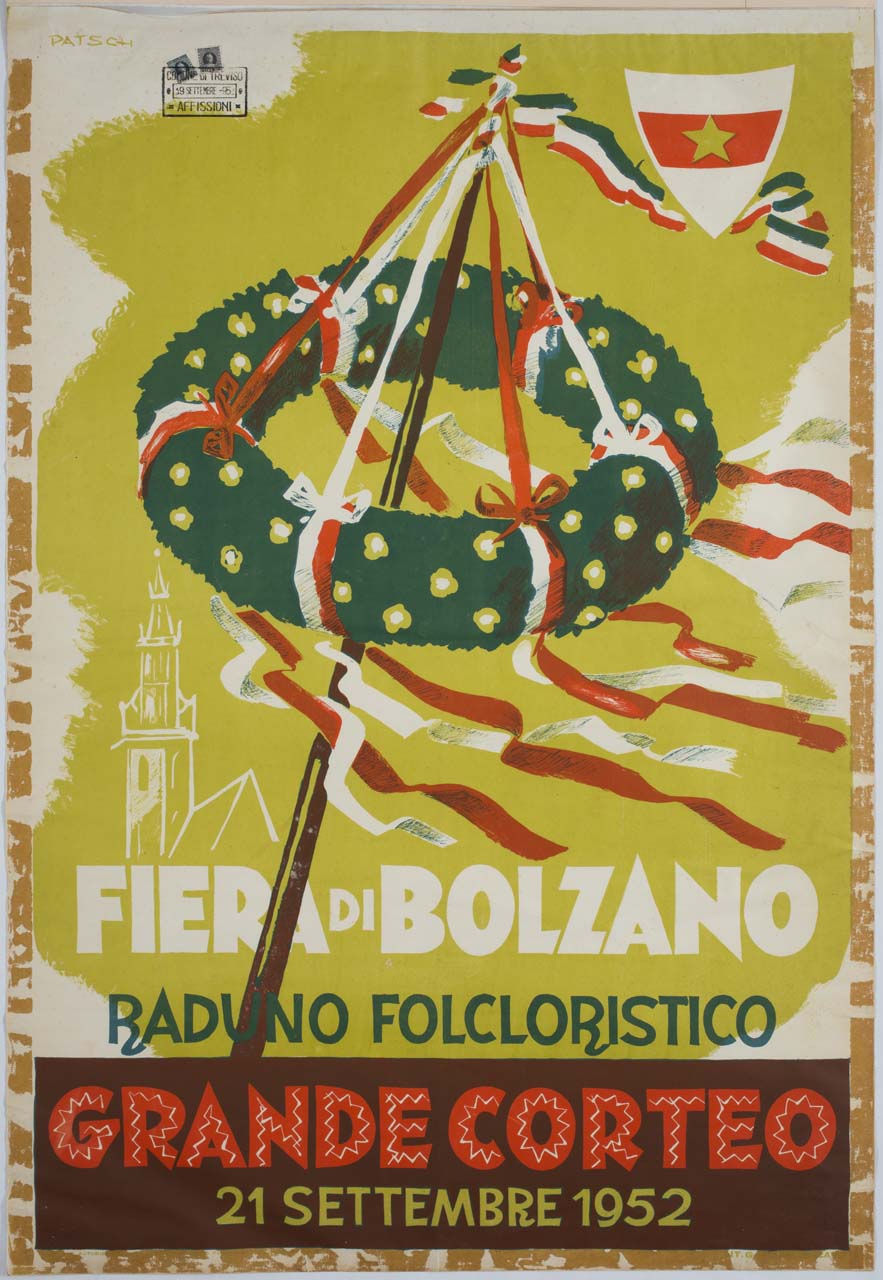 Lettura iconografica: ghirlanda; nastri; nastro tricolore; fiocchi; asta; stemma; campanile. Categoria merceologica/ tipo evento: manifestazioni culturali; tempo libero; folclore. Nomi: Fiera di Bolzano; Raduno folcloristico; Grande corteo; Campanile del Duomo di Bolzano. Luoghi: Bolzano