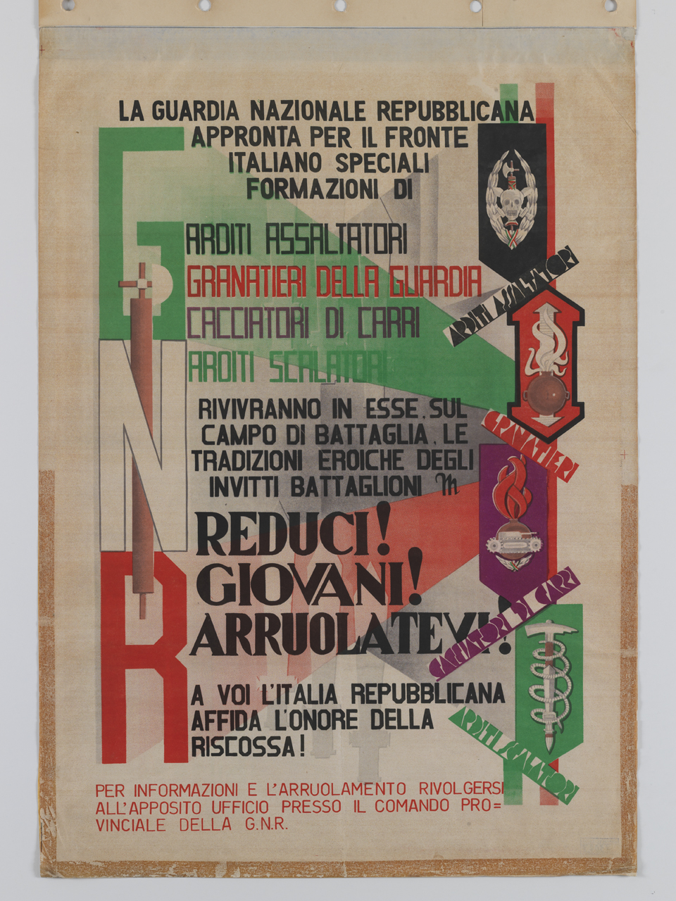 Lettura iconografica: fascio littorio; distintivi militari; bandiera tricolore. Categoria merceologica/ tipo evento: amministrazione pubblica; difesa nazionale; forze armate; esercito; informazione e comunicazione; norme di reclutamento; avviso; guerra; Seconda Guerra Mondiale. Nomi: GNR; Guardia Nazionale Repubblicana; Arditi Assalitori; Granatieri della Guardia; Cacciatori di Carri; Arditi Scalatori; RSI; Repubblica Sociale Italiana