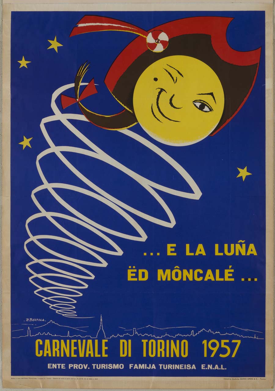 Lettura iconografica: luna; occhiolino; città; collina; sagome; nastri; spirale; stelle; maschere; cappello; coccarda. Categoria merceologica/ tipo evento: tempo libero; manifestazioni culturali; folclore; carnevale; associazioni sociali. Nomi: Carnevale di Torino; Gianduja; Mole Antonelliana; collina di Moncalieri; Moncalieri; EPT Torino; Ente Provinciale Turismo di Torino; Famija Turineisa; ENAL; Ente Nazionale Lavoratori. Luoghi: Italia; Torino