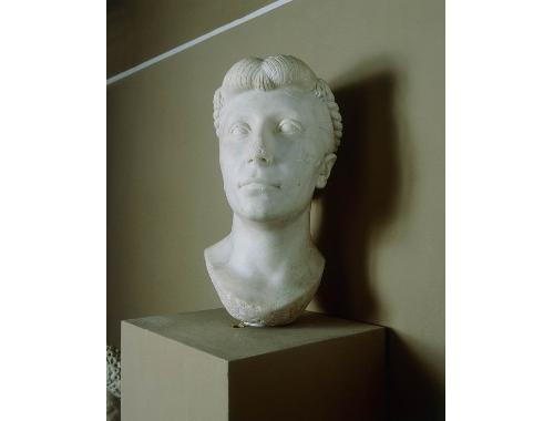 La testa, comprendente il collo delimitato nella zona inferiore da un taglio curvilineo, era originariamente pertinente ad una statua iconica. E' leggermente inclinata verso destra e rappresenta una giovane donna con fronte bassa, occhi grandi con bulbo non inciso, inquadrato da palpebre rigonfie, naso leggermente aquilino, zigomi poco pronunciati, bocca piccola con fossette ai lati, mento breve. I capelli, resi calligraficamente con linee sottili, sono raccolti sulla fronte in un ampio e rigonfio nodus e posteriormente in una bassa crocchia suddivisa in quattro ciocche. Un cordone parte dai lati del nodus e termina dietro la nuca intorno alla crocchia