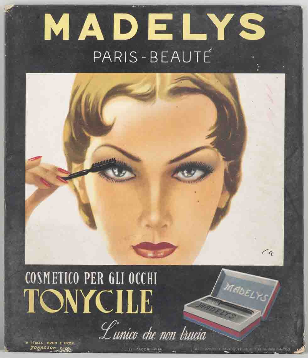 Lettura iconografica: figura femminile; volto; mascara; spazzolino; scatola. Categoria merceologica/ tipo evento: industria chimica; cosmetici; mascara. Nomi: Institut de beauté Madelys Paris-Beauté; Tonycile; Società per Azioni Jonasson; Sigismondo Jonasson. Luoghi: Pisa; Francia; Parigi