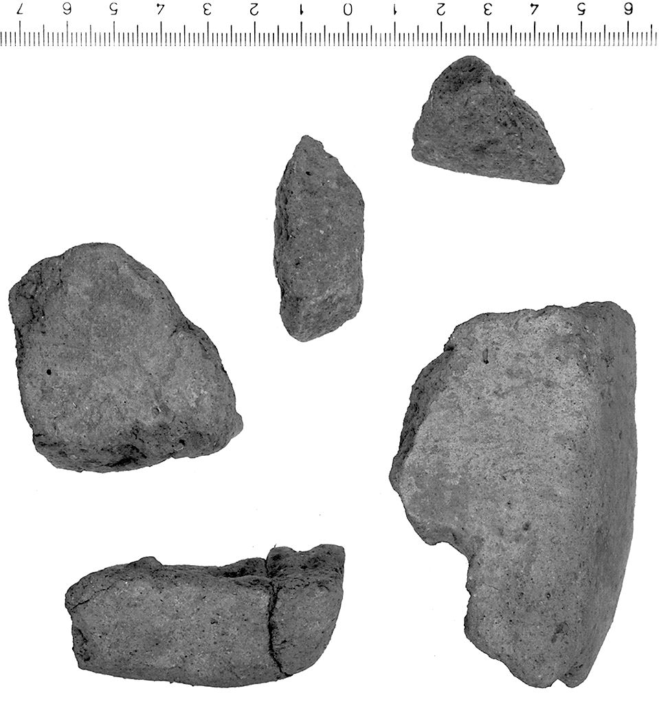 Cinque frammenti di pesi da telaio troncopiramidali, con spigoli arrotondati, di cui il maggiore con parte di foro passante. A crudo. Tracce di ingubbiatura biancastra. Impasto arancio poroso, con evidenti inclusi rossastri e bianchi.