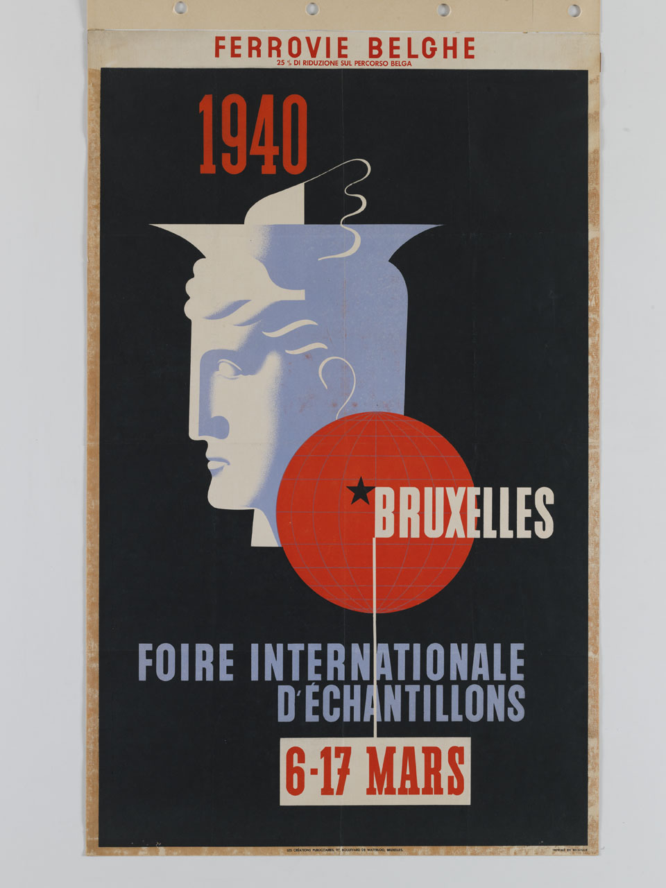 Lettura iconografica: figura maschile; volto; globo terrestre. Categoria merceologica/ tipo evento: commercio; industria; artigianato; agricoltura; fiere; riduzioni ferroviarie; turismo; associazioni di promozione turistica. Nomi: Foire Internationale d'échantillons Bruxelles; Ferrovie Belghe; Chemin de Fer Belges; SNCB; Société nationale des chemins de fer belges. Luoghi: Belgio; Bruxelles