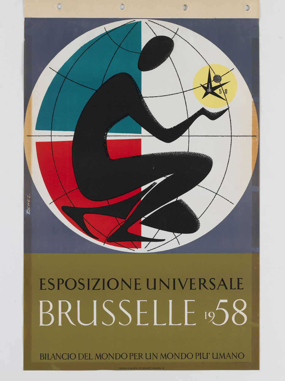 Lettura iconografica: figura; globo terrestre. Categoria merceologica/ tipo evento: commercio; industria; artigianato; agricoltura; fiere. Nomi: Esposizione Universale Brusselle 1958. Luoghi: Belgio; Brusselle; Bruxelles