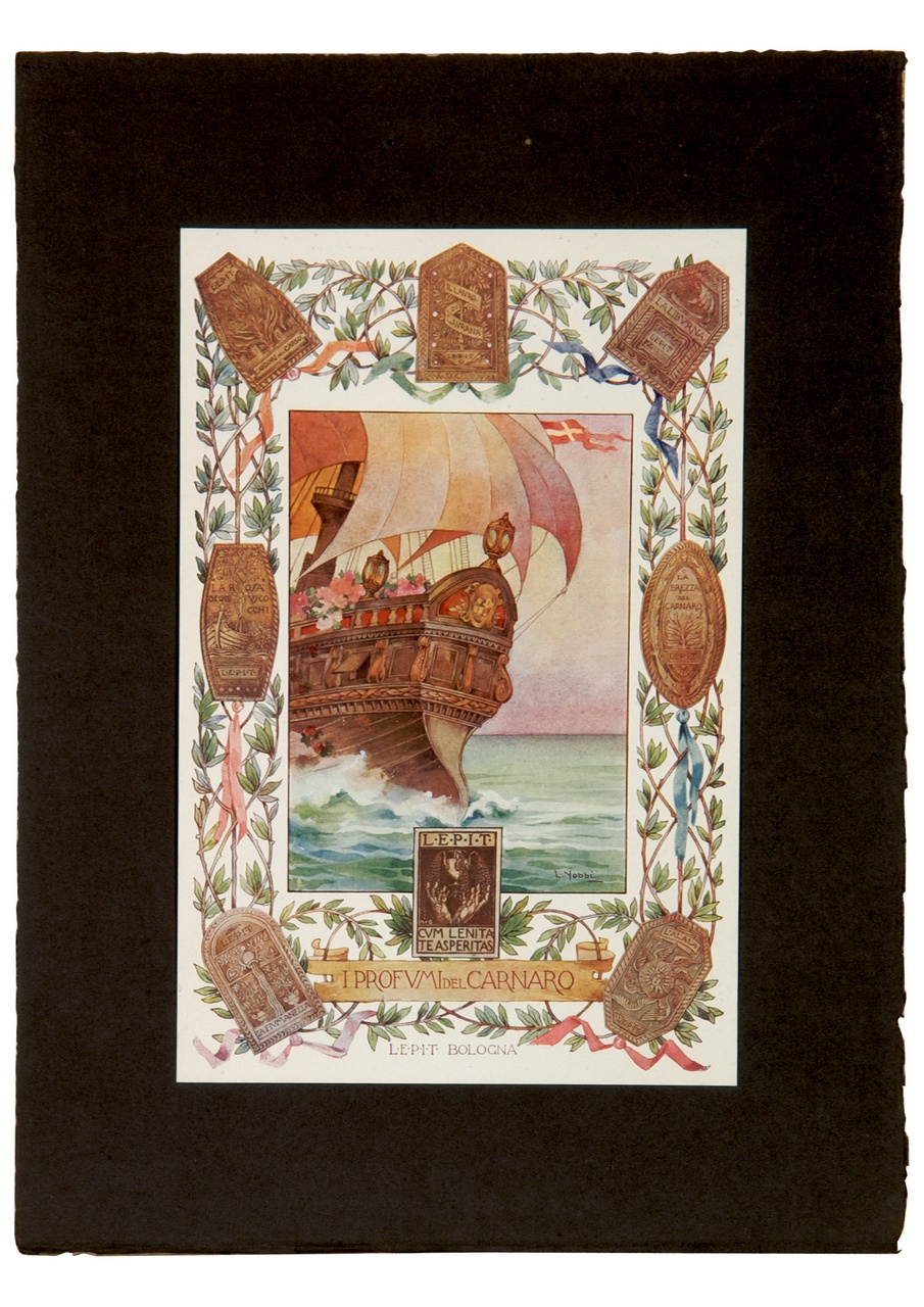 Lettura iconografica: veliero; mare; alloro; confezioni di profumo; nastri. Categoria merceologica/ tipo evento: industria chimica; profumi. Nomi: I Profumi del Carnaro; L.E.P.I.T.; LEPIT; Il Lauro di Laurana; La Uburna; La Brezza del Carnaro; L'Alalà; La Fiumanella; La Rosa degli Uscocchi; L'Ardore del Carso. Luoghi: Bologna