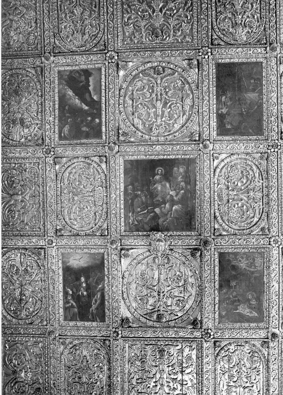 Il dipinto è inserito nel soffitto a cassettoni in legno intagliato e dorato. Il soggetto rappresenta "Transito della Vergine".. Personaggi: Madonna; Apostoli