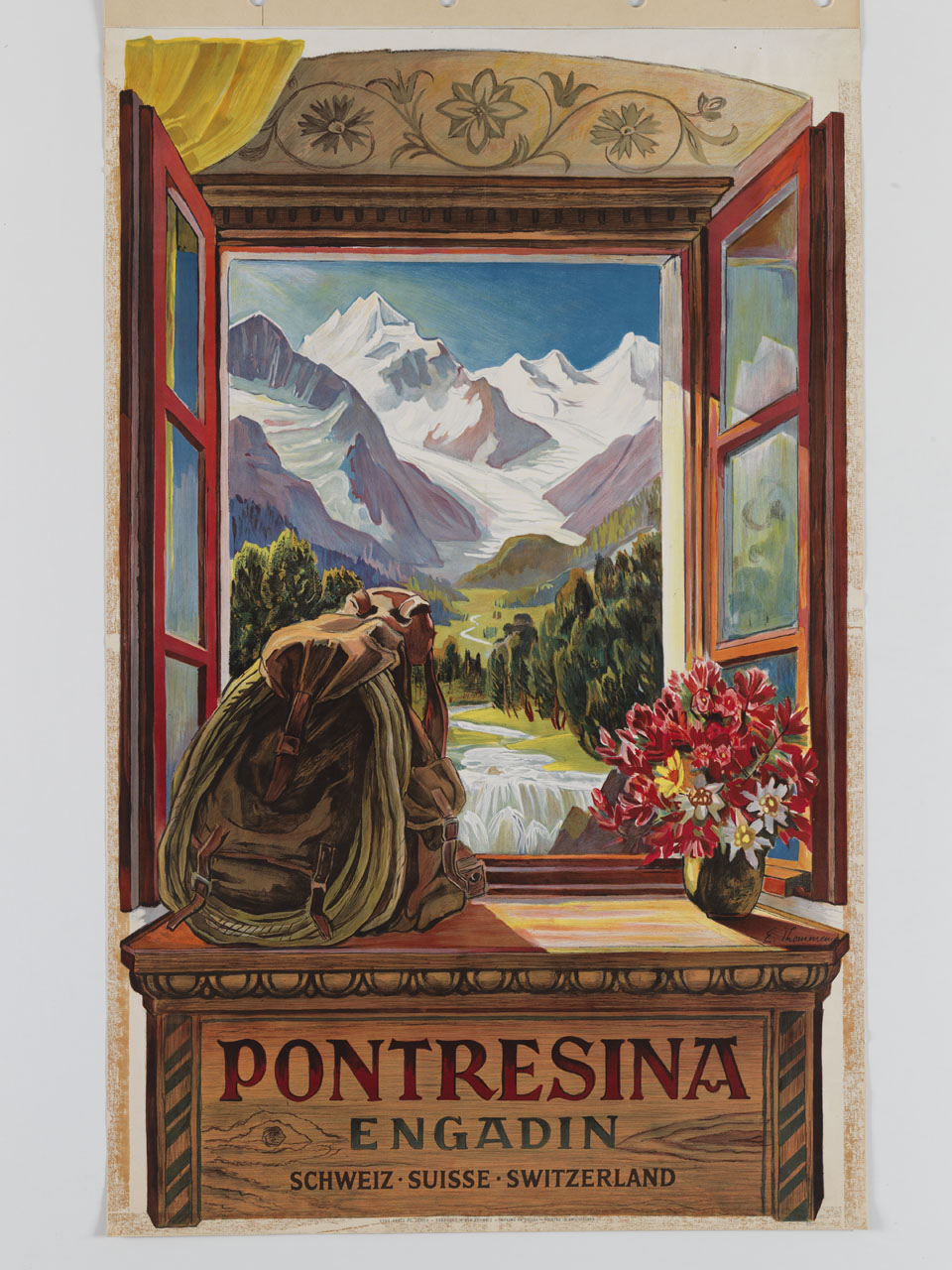 Lettura iconografica: finestra; montagne; zaino; corda; vaso con fiori. Categoria merceologica/ tipo evento: turismo; montagna. Luoghi: Schweitz; Suisse; Switzerland; Svizzera; Engadina; Maloja; Pontresina