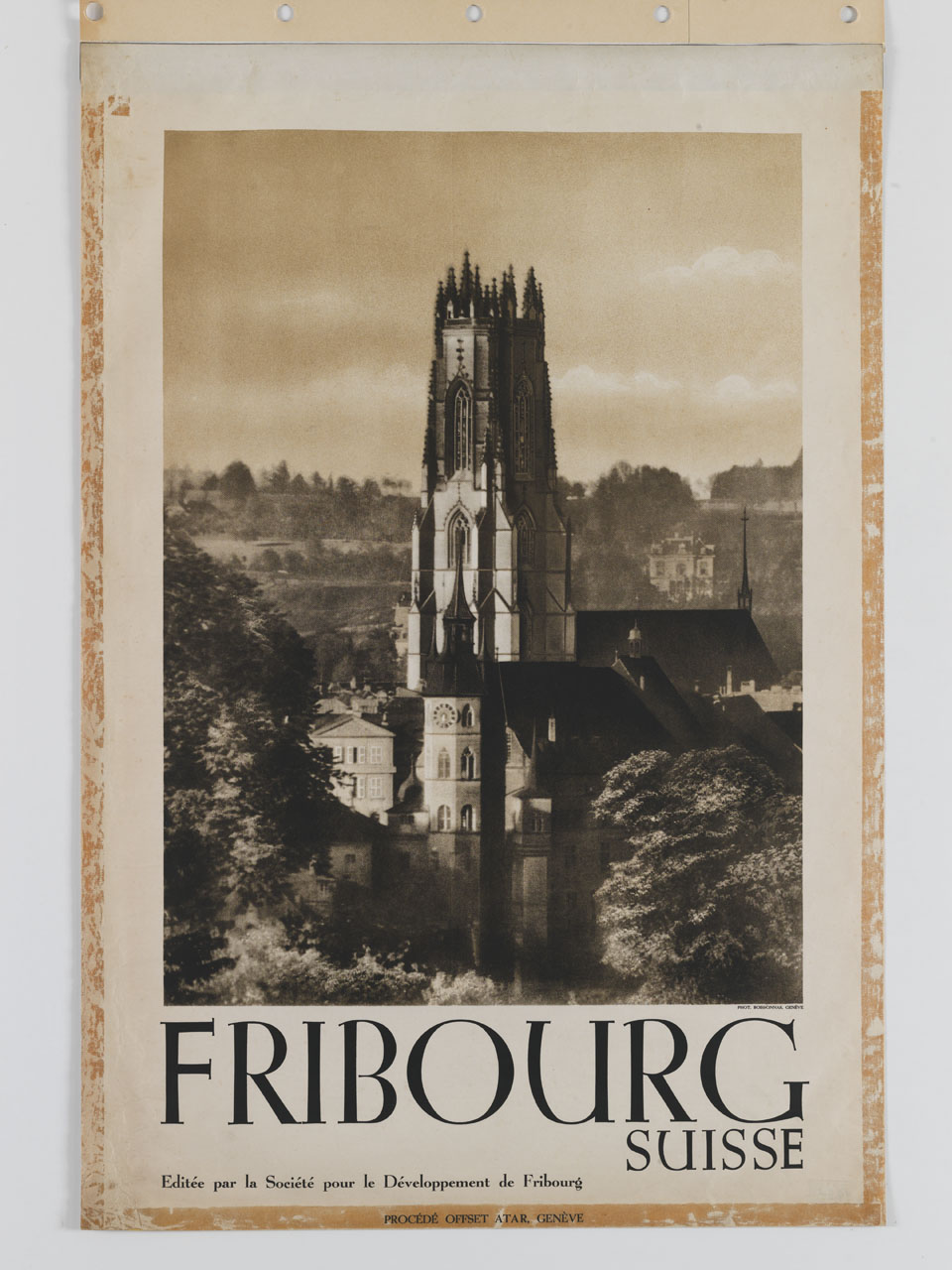 Lettura iconografica: veduta di città; architetture; campanile della cattedrale di San Nicola. Categoria merceologica/ tipo evento: turismo; enti di promozione turistica. Nomi: Societé pour le Développement de Fribourg. Luoghi: Suisse; Svizzera; Fribourg; Friburgo