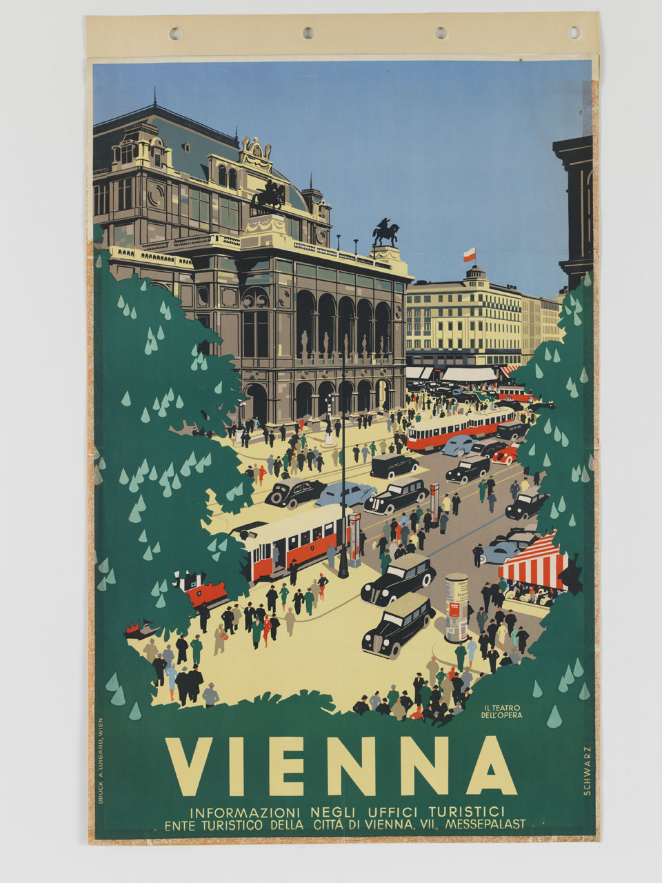 Lettura iconografica: veduta di città; architetture; Staatsoper; Teatro dell'Opera; strada; Ringstraße; figure maschili; figure femminili; automobili; tram; bandiera di città; alberi stilizzati. Categoria merceologica/ tipo evento: turismo. Nomi: Vienna. Luoghi: Austria
