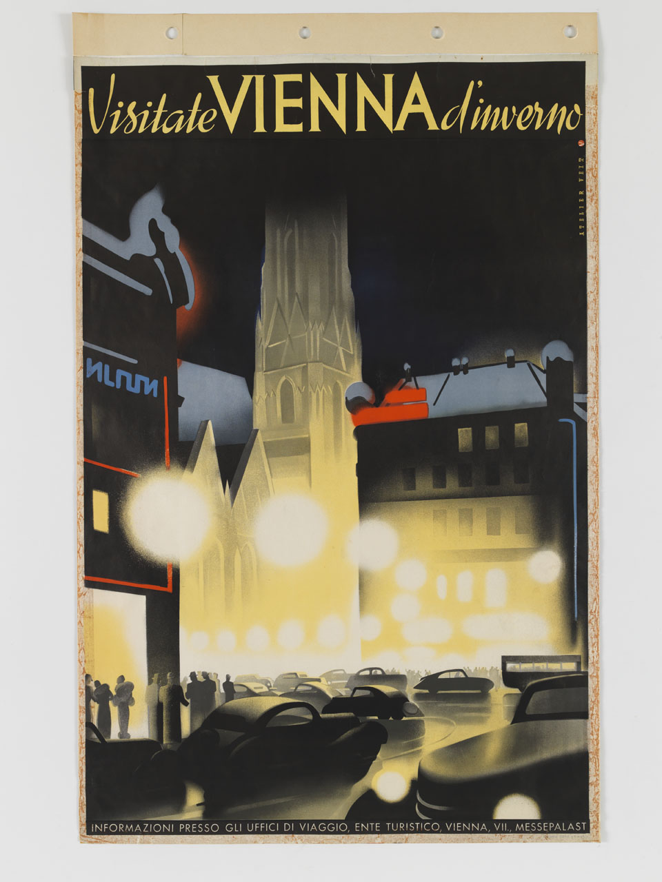 Lettura iconografica: veduta di città; architetture; Stephansdom; duomo di Santo Stefano; campanile; palazzi; piazza; Stephansplatz; automobili; autobus; figure femminili; figure maschili; silhouettes; luci; neve. Categoria merceologica/ tipo evento: turismo; enti di promozione turistica. Nomi: Vienna; Ente Turistico di Vienna. Luoghi: Austria