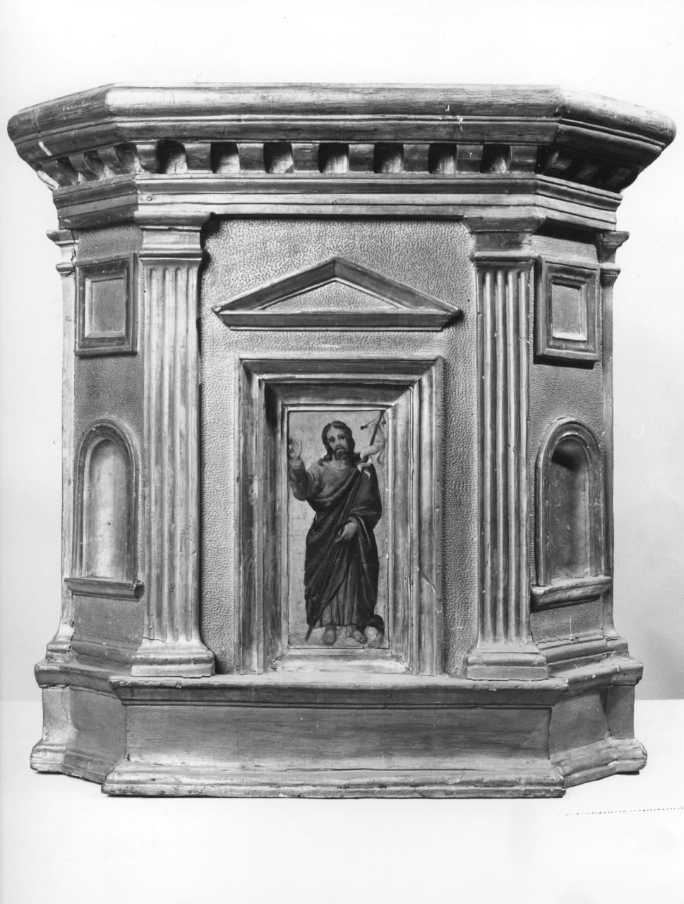 Tabernacolo di forma ottagonale, mancante della parte superiore a cupola, forse dispersa; sul davanti vi è una porticina che corrisponde ad una sul retro.. Soggetti sacri: Personaggi: Cristo