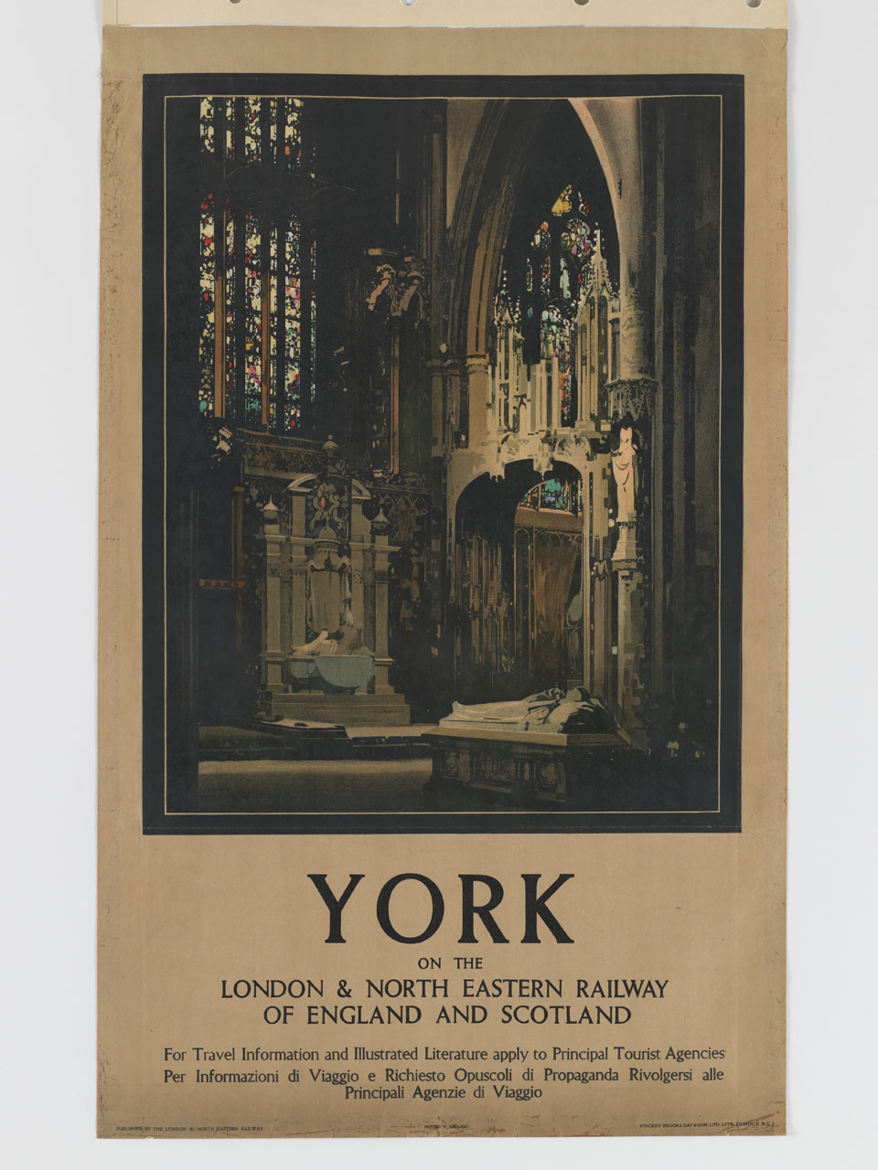 Lettura iconografica: veduta; chiesa; cattedrale di Saint Peter; York Minster; vetrate; cattedra. Categoria merceologica/ tipo evento: turismo; trasporti; trasporto terrestre; compagnia ferroviaria. Nomi: York; LNER; London North Eastern Railway. Luoghi: Regno Unito; Inghilterra; North Yorkshire