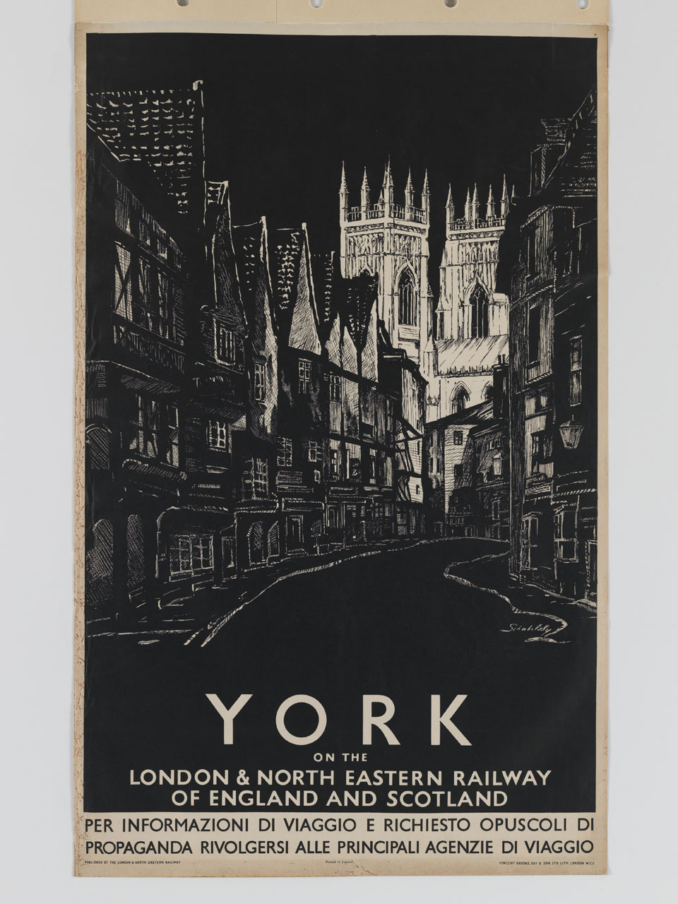 Lettura iconografica: veduta di città; strada; case; The Shambles; chiesa; cattedrale di Saint Peter; York Minster. Categoria merceologica/ tipo evento: turismo; trasporti; trasporto terrestre; compagnia ferroviaria. Nomi: York; LNER; London North Eastern Railway. Luoghi: Regno Unito; Inghilterra; North Yorkshire