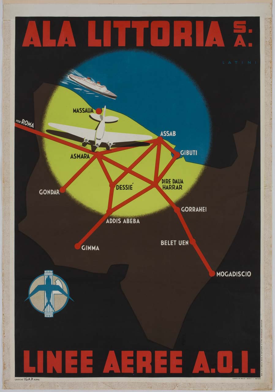 Lettura iconografica: cartina del Corno d'Africa; nave; aeroplano; rotte aeree. Categoria merceologica/ tipo evento: trasporti; trasporto aereo; compagnia aerea. Nomi: Ala Littoria; Linee Aeree dell'Africa Orientale Italiana. Luoghi: Roma; Africa; Corno d’Africa; Eritrea; Massaua; Asmara; Assab; Gibuti; Etiopia; Dessiè; Dire Daua; Harrar; Gondar; Gorrahei; Addis Abeba; Gimma; Somalia; Belet Uen; Mogadiscio
