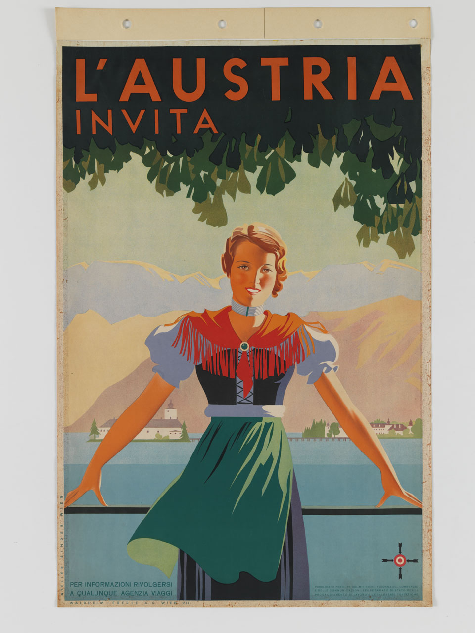 Lettura iconografica: figura femminile; costume tradizionale; montagne; lago; castello; paese. Categoria merceologica/ tipo evento: turismo; montagna; lago; agenzie di viaggi; amministrazione pubblica; amministrazione centrale; Ministero federale del commercio e delle comunicazioni. Nomi: Austria; Traunsee; Schloss Ort; Segretariato di Stato per il procacciamento di lavoro e le industrie turistiche. Luoghi: Alta Austria; Gmunden