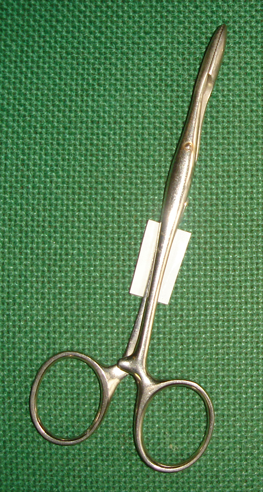 Pinza emostatica piana, retta, con presa a forbice. I bracci sono uniti con perno ad incastro. Presa a becco allungato, corto con branche zigrinate all’interno. Su uno dei bracci della pinza è inciso il numero 55.