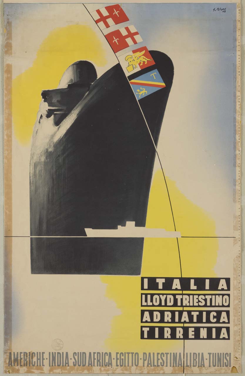 Lettura iconografica: prua; nave; transatlantico; bandiere; Leone di San Marco. Categoria merceologica/ tipo evento: trasporti; trasporto marittimo; compagnia di navigazione; turismo; crociere. Nomi: Italia; Lloyd Triestino; Adriatica; Tirrenia. Luoghi: Genova; Napoli; Venezia; Trieste; America; Americhe; Egitto; India; Libia; Palestina; Sud Africa; Tunisi