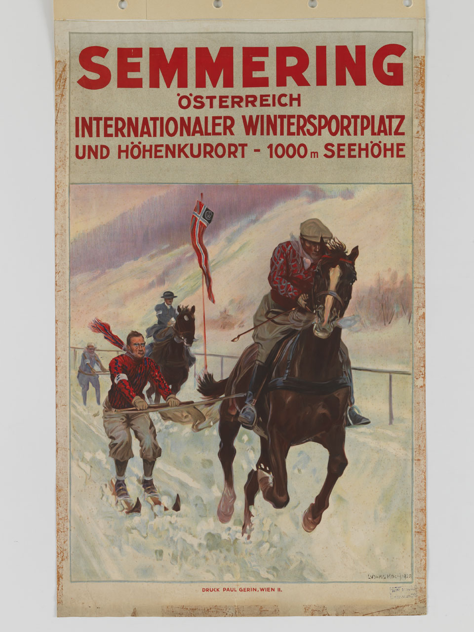 Lettura iconografica: figure maschili; fantini; sciatori; sci; cavalli; bandiera; montagna; neve. Categoria merceologica/ tipo evento: turismo; montagna; terme; sport; skijöring equestre; sci. Nomi: Semmering. Luoghi: Austria; Neunkirchen