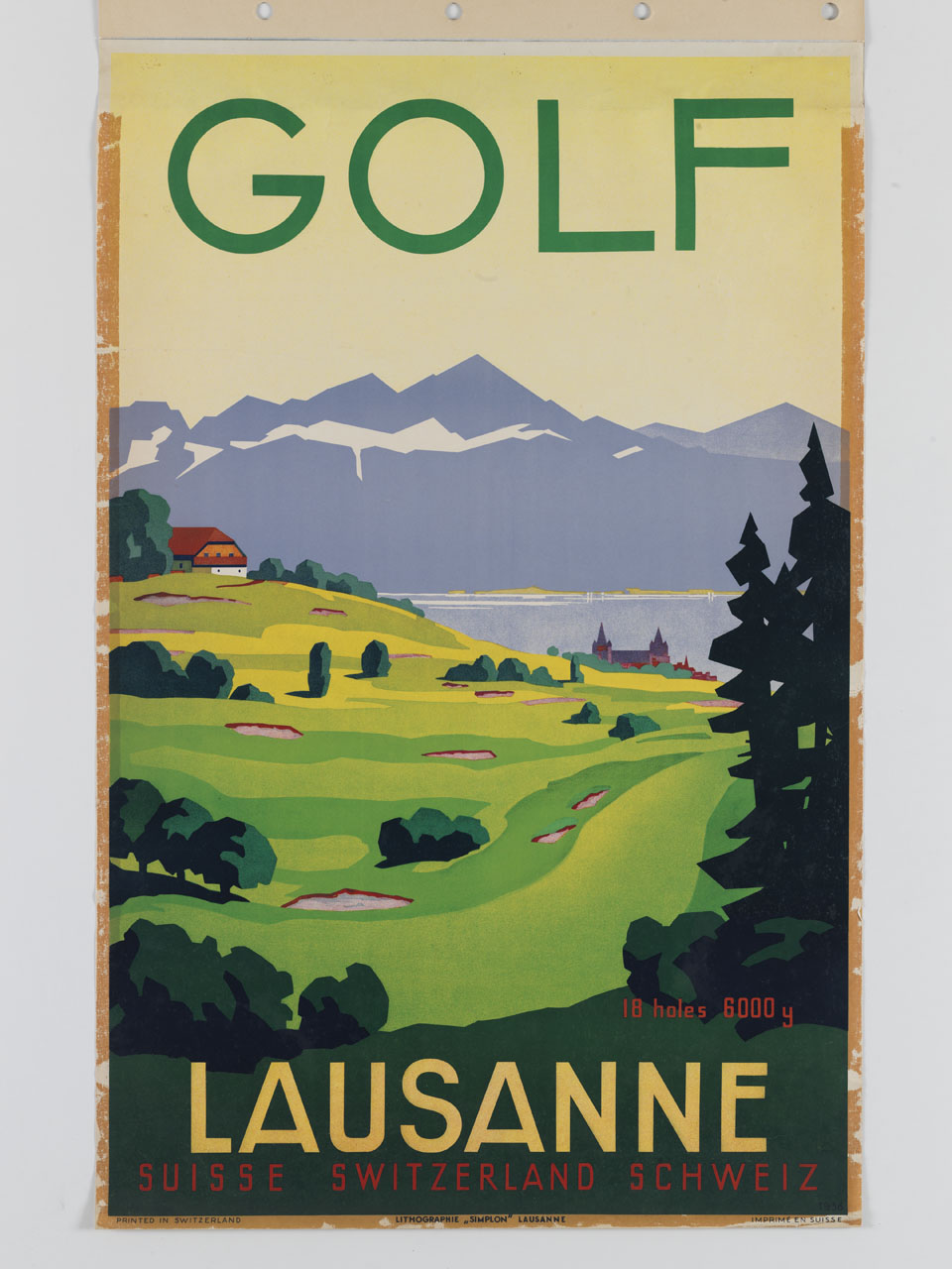 Lettura iconografica: campo da golf; lago; montagne. Categoria merceologica/ tipo evento: tempo libero; sport; impianti sportivi; campo da golf. Nomi: Lausanne; Losanna; Lago di Ginevra. Luoghi: Suisse; Switzerland; Schweiz; Svizzera; Canton Vaud