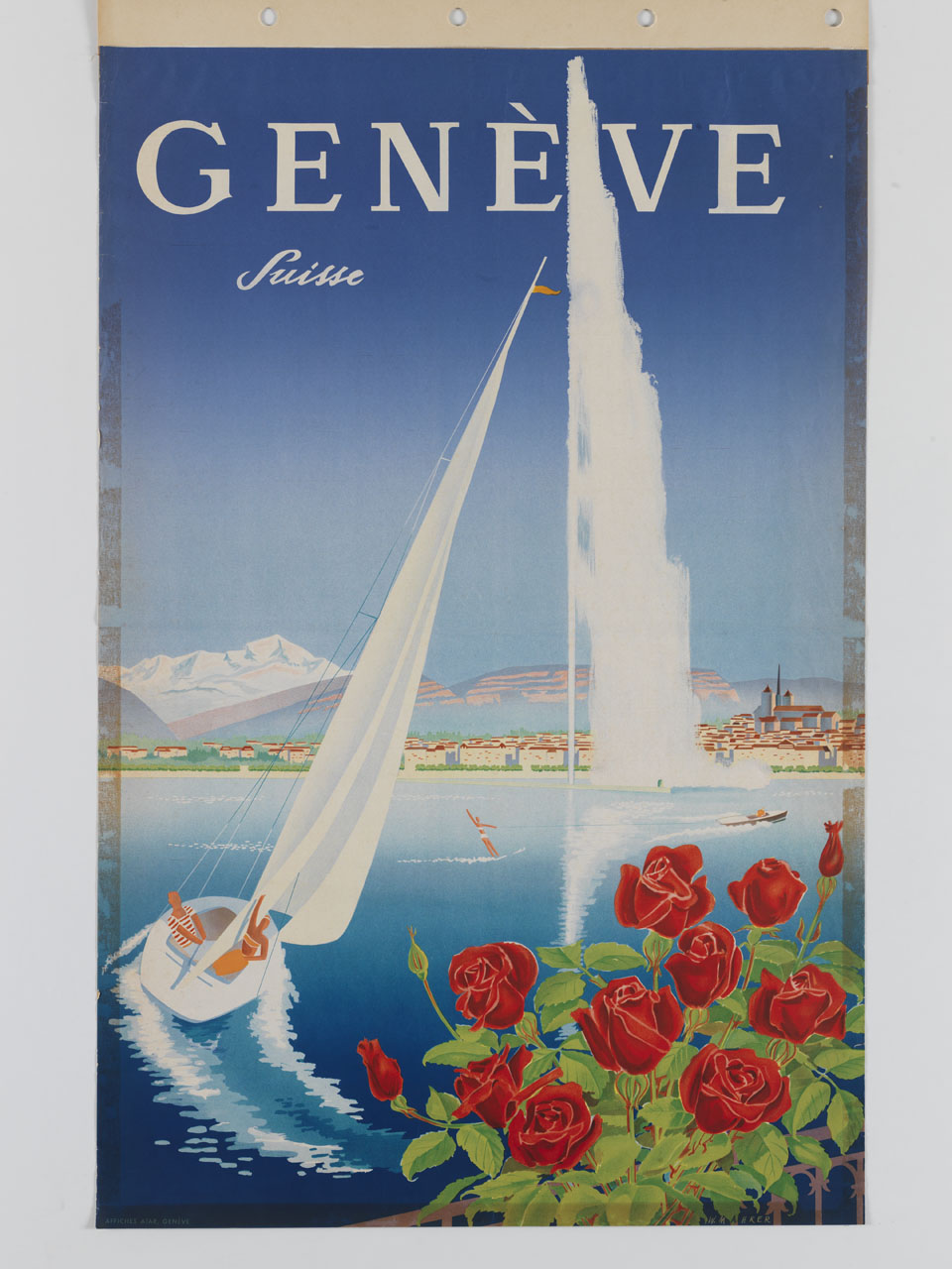Lettura iconografica: veduta; imbarcazioni; fiori; lago di Ginevra; veduta di città; architetture; cattedrale di San Pietro; montagne. Categoria merceologica/ tipo evento: turismo; lago. Nomi: Genève; Ginevra. Luoghi: Svizzera; Canton Vaud
