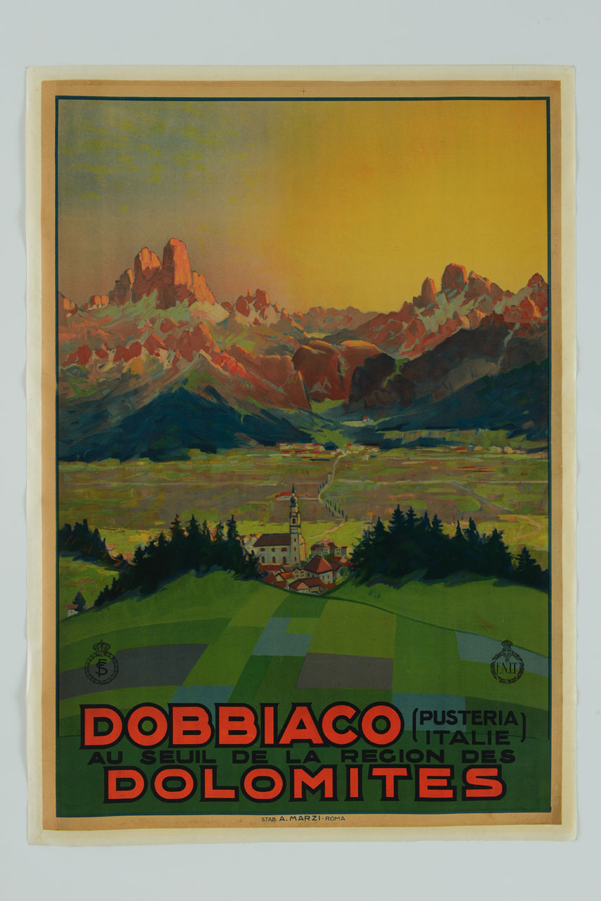 Lettura iconografica: valle; conca; paesi; edifici privati; edifici sacri; chiese; prati; foreste; alberi; abeti; montagne; picchi montani; neve. Categoria merceologica/ tipo evento: turismo; montagna; enti di promozione turistica; trasporti; compagnia ferroviaria. Nomi: Alta Pusteria; Alpi orientali; Dolomiti di Sesto; Tre Cime di Lavaredo; chiesa di San Giovanni Battista; ENIT; Ente Nazionale per l'incremento delle Industrie Turistiche; FS; Ferrovie dello Stato. Luoghi: Italia; Bolzano; Dobbiaco