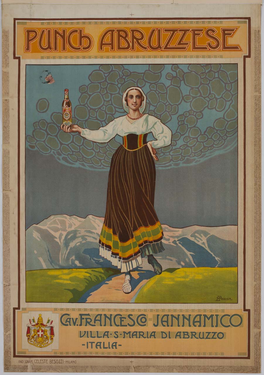 Lettura iconografica: figura femminile; costume tradizionale; bottiglia; paesaggio montano. Categoria merceologica/ tipo evento: industria alimentare; bevande; liquori; punch. Nomi: Punch abruzzese; Francesco Jannamico. Luoghi: Chieti; Villa Santa Maria