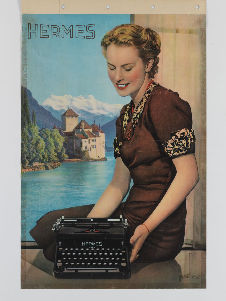 Lettura iconografica: figura femminile; macchina da scrivere; veduta; architetture; Castello di Chillon. Categoria merceologica/ tipo evento: industria manifatturiera; prodotti di cancelleria; macchina per scrivere. Nomi: Hermes; Hermes 2000; Paillard. Luoghi: Svizzera; Yverdon; Lago di Ginevra; Lago Lemàno