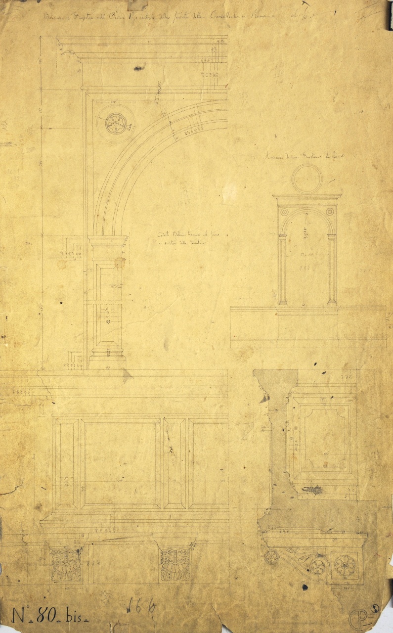 Dettagli costruttivi della facciata del palazzo della Cancelleria: prospetto quotato di parte di finestra e balcone del primo piano; prospetto quotato della finestra; sezione longitudinale quotata del balcone, Balcone e Finestra nell'Ordine 1°, o centrale, della facciata della Cancelleria in Roma