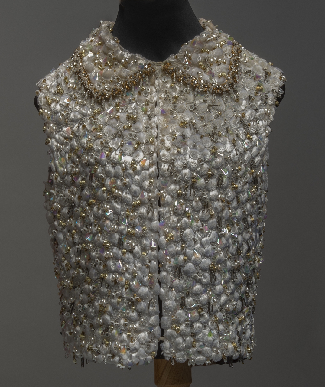 Dalla casa d'aste Bibelot di Firenze il capo in oggetto viene abbinato ad un completo tailleur costituito da gonna e giacca coordinata. Corpino/top corto in vita, senza maniche, con colletto piatto rovesciato e apertura centrale posteriore, chiusa da 5 ganci metallici e rispettive asole, rivestiti da spighetta bianco avorio. Interamente confezionato in leggerissima garza di seta bianca, operata con ordito supplementare a mo' di peluche (ordito di pelo), con effetto di piccoli ciuffi sparsi con regolarità sul fondo, tempestato a sua volta da perline opache a sezione cilindrica, in tinta. Foderato internamente in chiffon di seta bianco. Sull'intera superficie sono poi state riportate, a cucito, svariate tipologie di appliques di diverse forme, misure e materiali (perline, cannucce, scaglie madreperlacee e iridescenti, piccoli fiori in materiale plastico, strass, finti cristalli, etc.). Colletto profilato da gallone in filato metallico dorato, a sua volta decorato da perline e strass, a mo' di pendagli. Lungo l'orlo inferiore sono state cucite 3 piccole tasche contenenti dei pesi per mantenere l'aplomb dell'indumento. Non sono presenti etichette che ne attestino con certezza la provenienza sartoriale