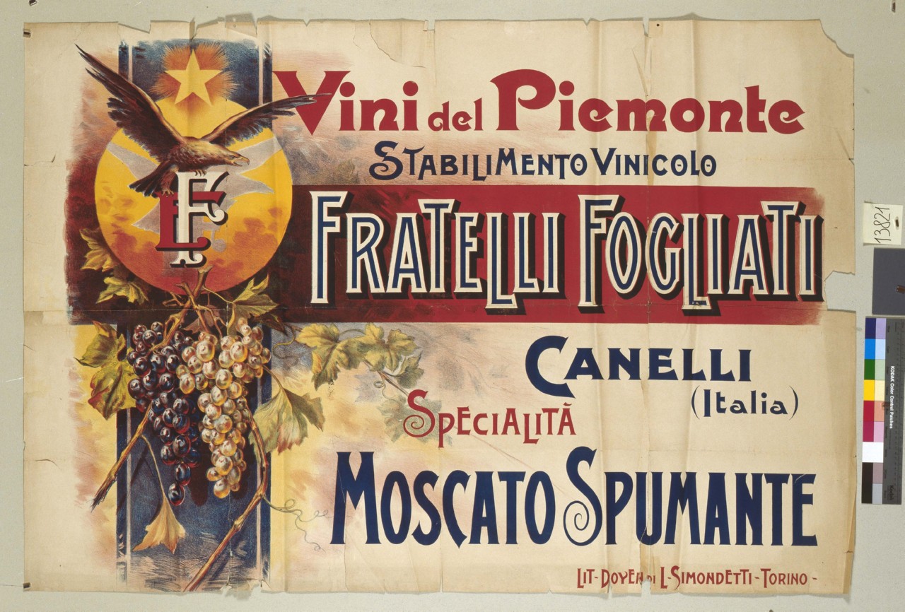 Lettura iconografica: stella; sole; uccello rapace; aquila; lettere dell'alfabeto; pianta del genere Vitis, della famiglia vitacee, legnose e rampicanti, con foglie intere e frutti a bacca (acini), riuniti in infruttescenze; grappoli d'uva. Categoria merceologica/ tipo evento: industria alimentare; bevande; vino spumante. Nomi: Fratelli Fogliati; Vini del Piemonte; Stabilimento Vinicolo; Moscato Spumante. Luoghi: Asti; Canelli