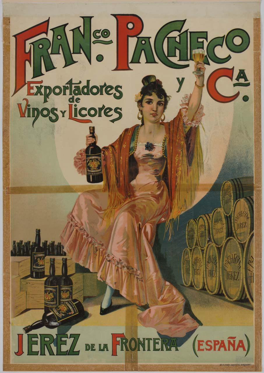 Lettura iconografica: figura femminile; scialle; botti; bottiglie di vino; bicchiere. Categoria merceologica/ tipo evento: industria alimentare; bevande; vino; liquori. Nomi: Franc.co Pacheco Y Ca.; Jerez de la Frontera. Luoghi: Espana; Spagna