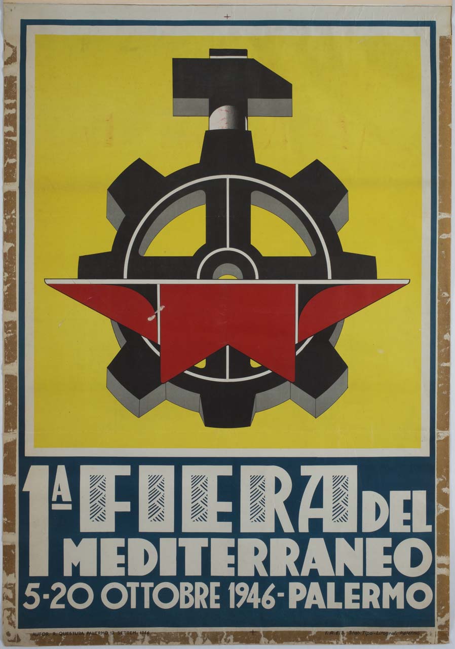 Lettura iconografica: ruota dentata; incudine; martello. Categoria merceologica/ tipo evento: commercio; industria; artigianato; agricoltura; fiere. Nomi: 1 Fiera del Mediterraneo. Luoghi: Palermo